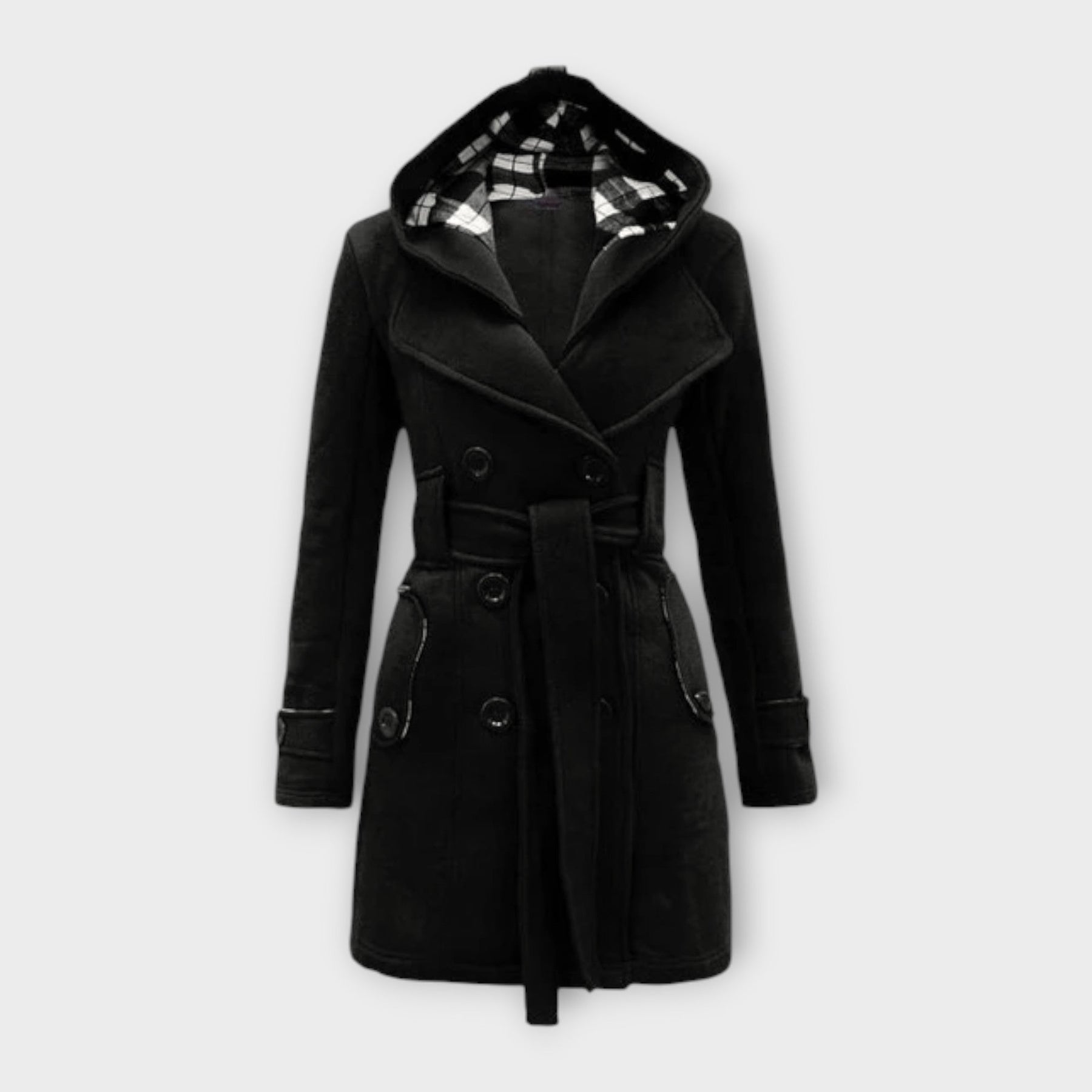 Avvolgiti in una sofisticazione senza tempo con il cappotto invernale Evelyn. Progettato per la donna moderna, offre una silhouette aggraziata con una vita cintata e eleganti rever, mentre la fodera con cappuccio assicura che tu rimanga calda e alla moda durante le giornate fredde.