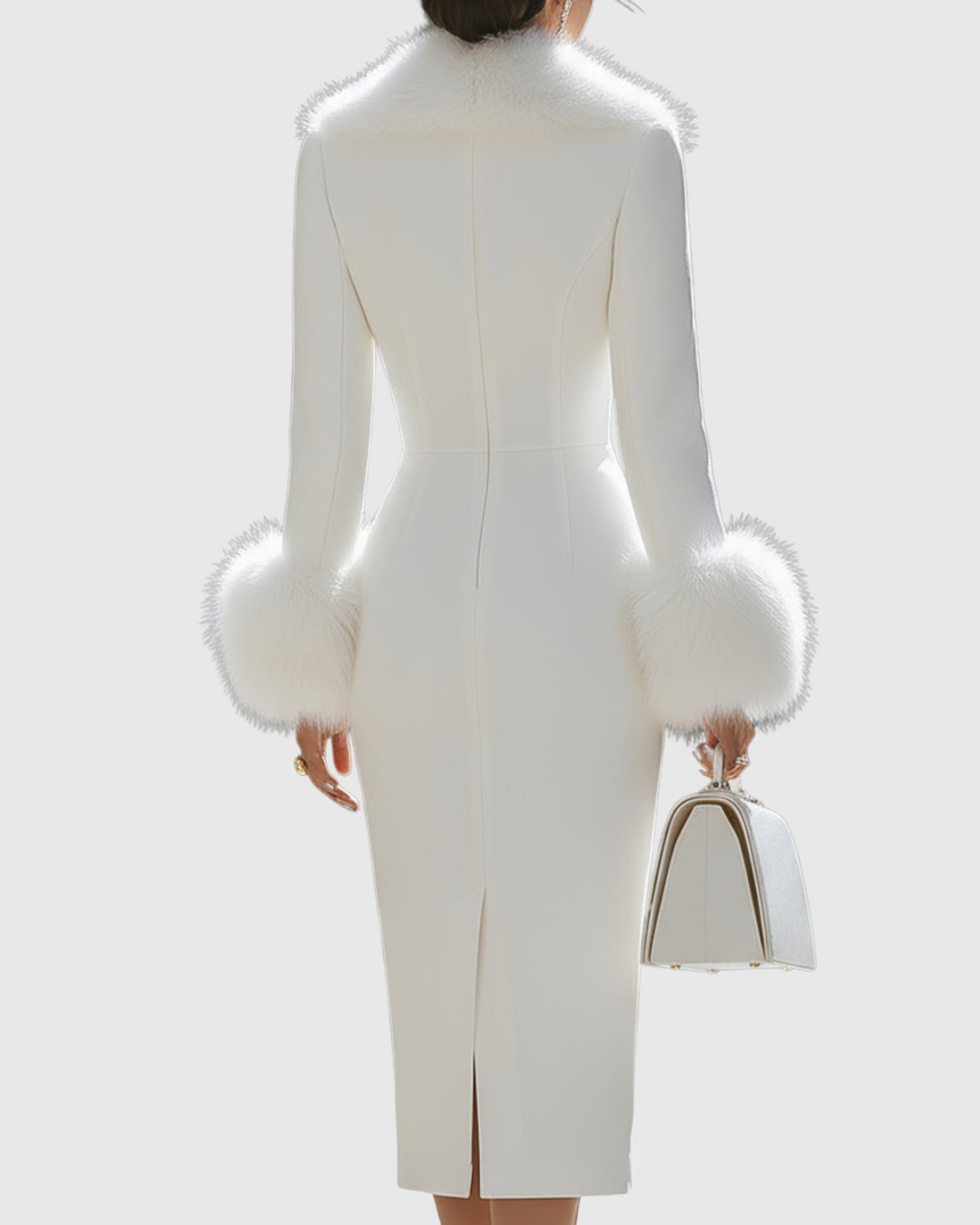 Entra in un mondo di raffinatezza senza tempo con questo abito midi bianco immacolato con rifiniture, l'emblema del lusso raffinato. Caratterizzato da morbidi dettagli in pelliccia sintetica sul colletto e sui polsini, unisce il taglio moderno al fascino classico dell'inverno. La silhouette aderente valorizza la figura senza sforzo, rendendolo una scelta sensazionale per serate eleganti, incontri invernali o occasioni formali.
